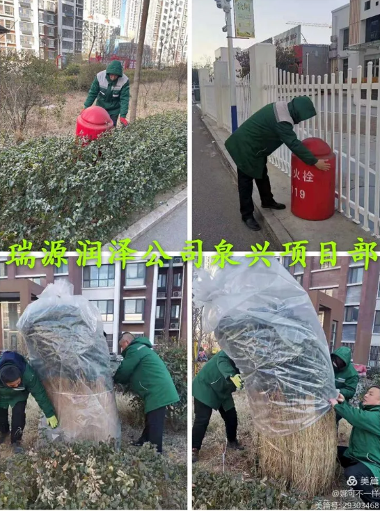 瑞源潤(rùn)澤公司泉興項(xiàng)目部為應(yīng)對(duì)寒潮天氣,對(duì)小區(qū)綠化樹木、室外消防栓做保溫。面對(duì)極寒天氣,物業(yè)工作人員不畏嚴(yán)寒、不辭辛勞,毅然堅(jiān)守在工作一線,認(rèn)真巡視、巡檢,不漏過(guò)一個(gè)死角,全力保障設(shè)施設(shè)備的安全運(yùn)行。測(cè)溫、查驗(yàn)健康碼等工作一樣不漏。在此次寒潮來(lái)襲期間,我們齊心協(xié)力、全力以赴,經(jīng)受住極端天氣的考驗(yàn)。